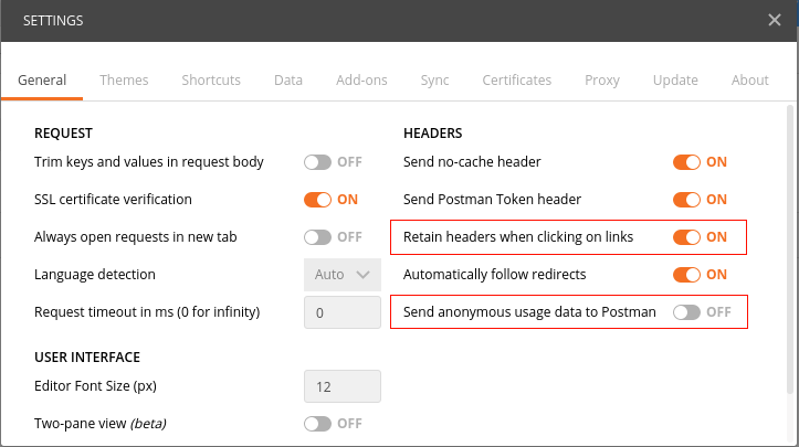The option Send anonymous usage data to Postman should be deactivated by setting to OFF.